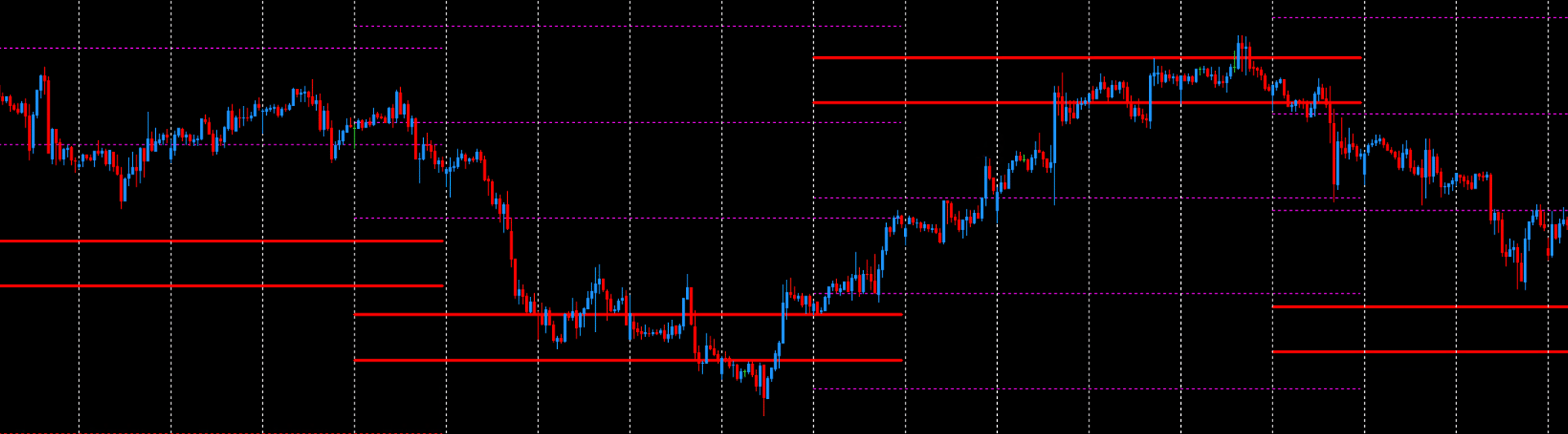 Magenta levels are three dashed lines that are determined in the same way as Red levels. Magenta levels divide the space between Red levels into four equal quarters. It is expected that the price will react to the Magenta levels, making them an important element in analysis and trading strategies.
